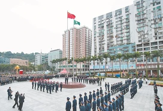 8时整,澳门警察乐队奏响雄壮的《义勇军进行曲》。在澳门培正中学的100名中学生领唱下,全场观礼人士面向旗杆肃立,伴随旋律高唱国歌。鲜艳的五星红旗和澳门特区区旗在众人的注视中,缓缓升到旗杆顶点,在晨风中徐徐飘扬。