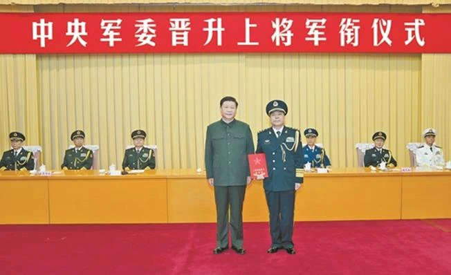 下午4时30分许,晋衔仪式在庄严的国歌声中开始。中央军委副主席许其亮宣读了中央军委主席习近平签署的晋升上将军衔命令。中央军委副主席张又侠主持晋衔仪式。