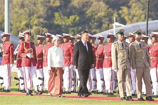 当地时间1月17日下午,国家主席习近平在内比都总统府出席缅甸总统温敏举行的隆重欢迎仪式。