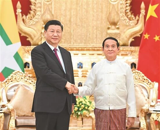 习近平强调,我们刚刚庆祝新中国成立70周年。70年来,中国取得巨大发展成就的实践证明,中国人民选择的发展道路是成功的,我们将继续坚定不移地走下去。对中国的未来,我们充满信心。中国将坚持和平发展,坚持永不称霸。为此,我提出推动构建人类命运共同体,希望这个地球村里的各国能够和睦相处、互利共赢。构建人类命运共同体,首先从周边做起,坚持睦邻安邻富邻。中国开展对外合作从不强加于人,从不干涉别国内政,反对你输我赢、单边通吃。中方愿同缅方在共建“一带一路”框架下稳步推进中缅经济走廊重点合作项目的建设,更多惠及当地人民,使他们有更多的获得感和幸福感。中方也将继续在国际舞台上坚定支持缅甸维护合法权益和国家尊严。