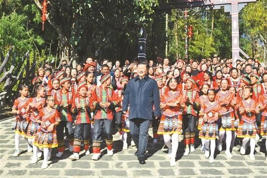 习近平走进三家村中寨司莫拉佤族村,了解乡村振兴和建设少数民族特色村寨情况。“司莫拉”在佤语中意为幸福的地方。该村有500多年历史,是中国传统村落、少数民族特色村寨,佤、汉、白、傣等多个民族和谐共处。