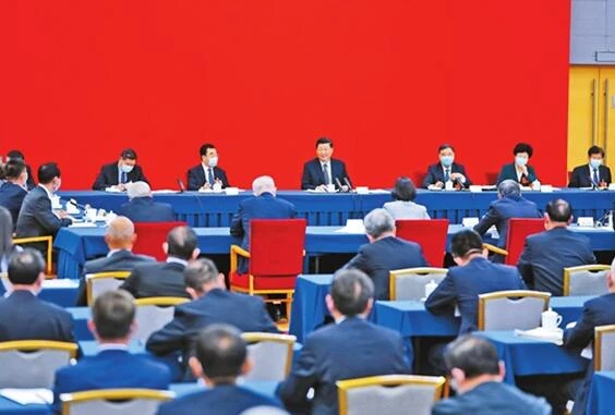 5月23日上午,中共中央总书记、国家主席、中央军委主席习近平看望参加全国政协十三届三次会议的经济界委员,并参加联组会,听取意见和建议。中共中央政治局常委、全国政协主席汪洋参加看望和讨论。 新华社记者 谢环驰 摄