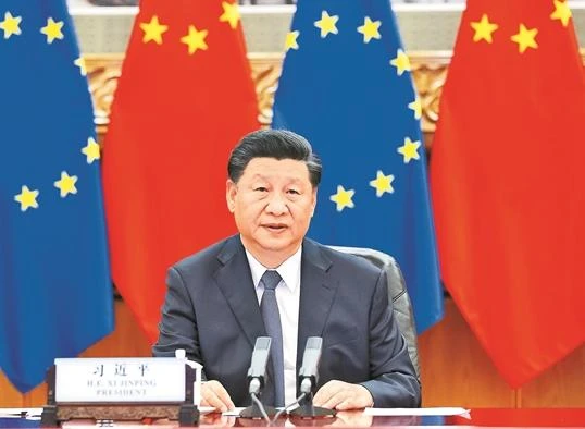 习近平指出,当前,新冠肺炎疫情全球大流行使百年未有之大变局加速演进。人类面临许多共同挑战,正站在新的十字路口。中欧作为世界两大力量、两大市场、两大文明,越是面对这样的形势,越要牢牢把握相互支持、团结合作的大方向,越要坚定不移推动中欧全面战略伙伴关系健康稳定发展,为国际社会抗击疫情、恢复经济、维护正义注入更多正能量。