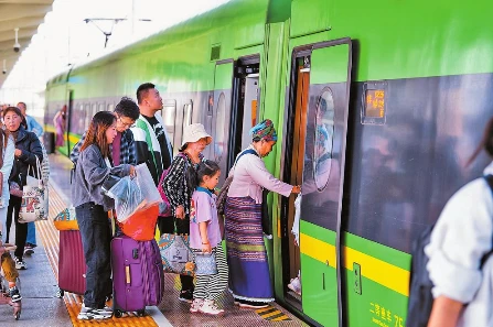 在中老铁路西双版纳站,旅客有序排队上车。供图