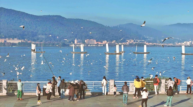 冬日暖阳下,滇池畔海埂大坝群鸥翔集,红嘴鸥或展翅飞翔,或掠过水面觅食,游客手持鸥粮与鸟互动,欢声笑语和着鸟鸣声声,鸥翔人欢的场景成为春城亮丽的风景。(记者 高吴双 摄)