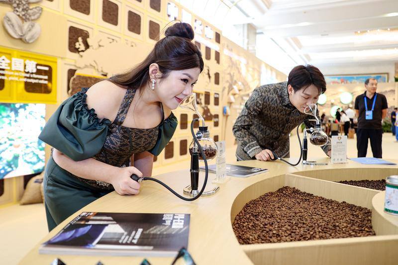 9月16日,在2025“一带一路”媒体合作论坛现场,来自中柬埔寨的网络达人通过咖啡闻香瓶感受云南咖啡的不同风味。