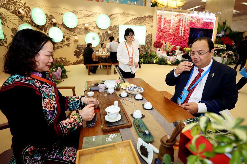 “滇红集团的前身‘顺宁实验茶厂’于1939年在临沧市凤庆县建立。当时在抗战时期,我们的红茶做好后运到香港出口,在伦敦交易市场换回大量抗日救灾的物资。”在“世界茶源”展区,滇红集团凤庆凤牌茶叶有限公司企划部周莉娜介绍,滇红曾先后被赠送给访问中国云南的英国女王伊丽莎白二世、威廉王子,也曾先后到英国肯辛顿宫和德国柏林交流展示中华茶文化。这次来参展,就是广交“一带一路”共建国家的朋友,让更多的人知晓云南“滇红”甜和醇。