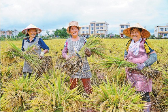 近日,晋宁区晋城街道沙堤村示范种植的800亩生态水稻进入收割期,金黄的稻田呈现一派丰收景象,农户忙着在田间抢收成熟水稻,确保颗粒归仓。图为晋宁沙堤村农户在田间抢收水稻。