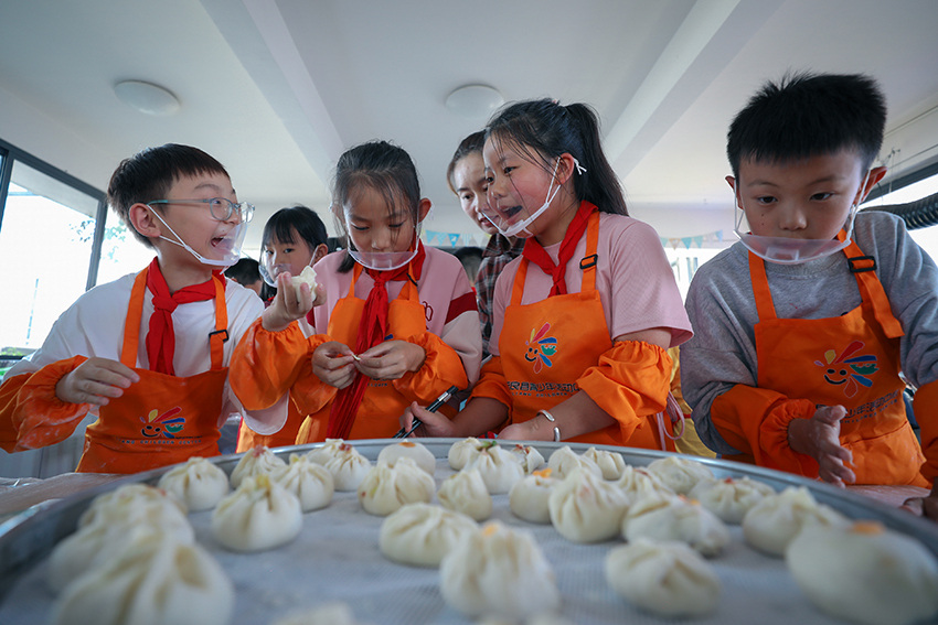 图为9月16日,该小学青少年活动中心的“小厨房”教室里,学生在学习制作包子。王勇 摄