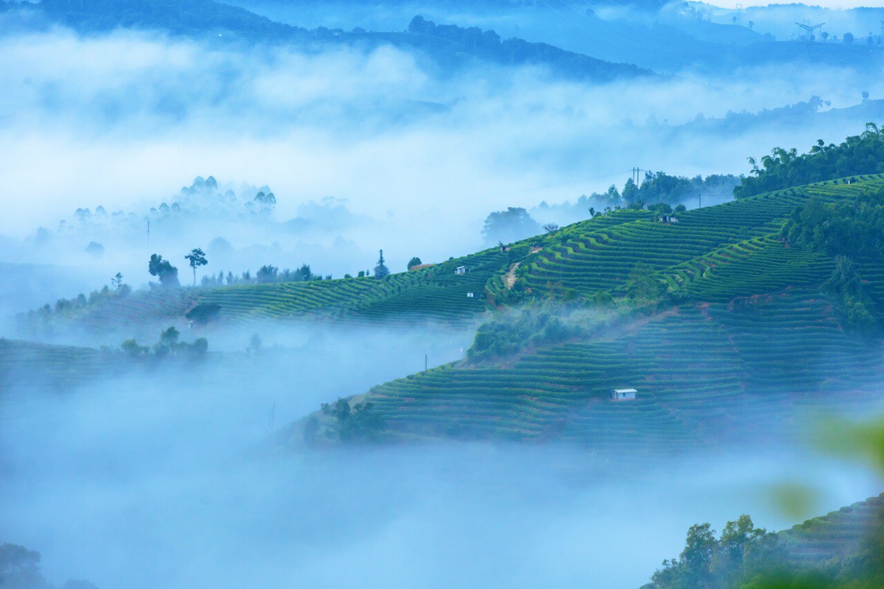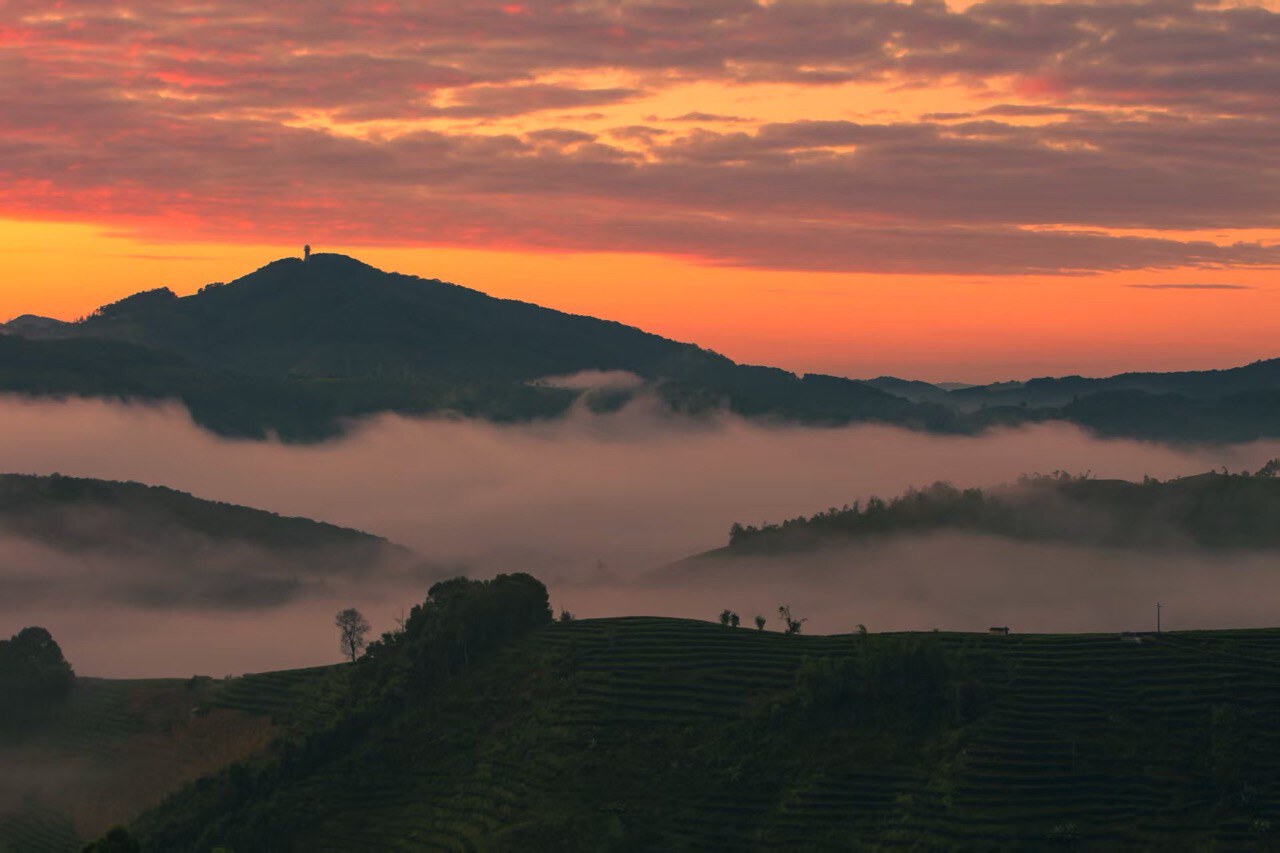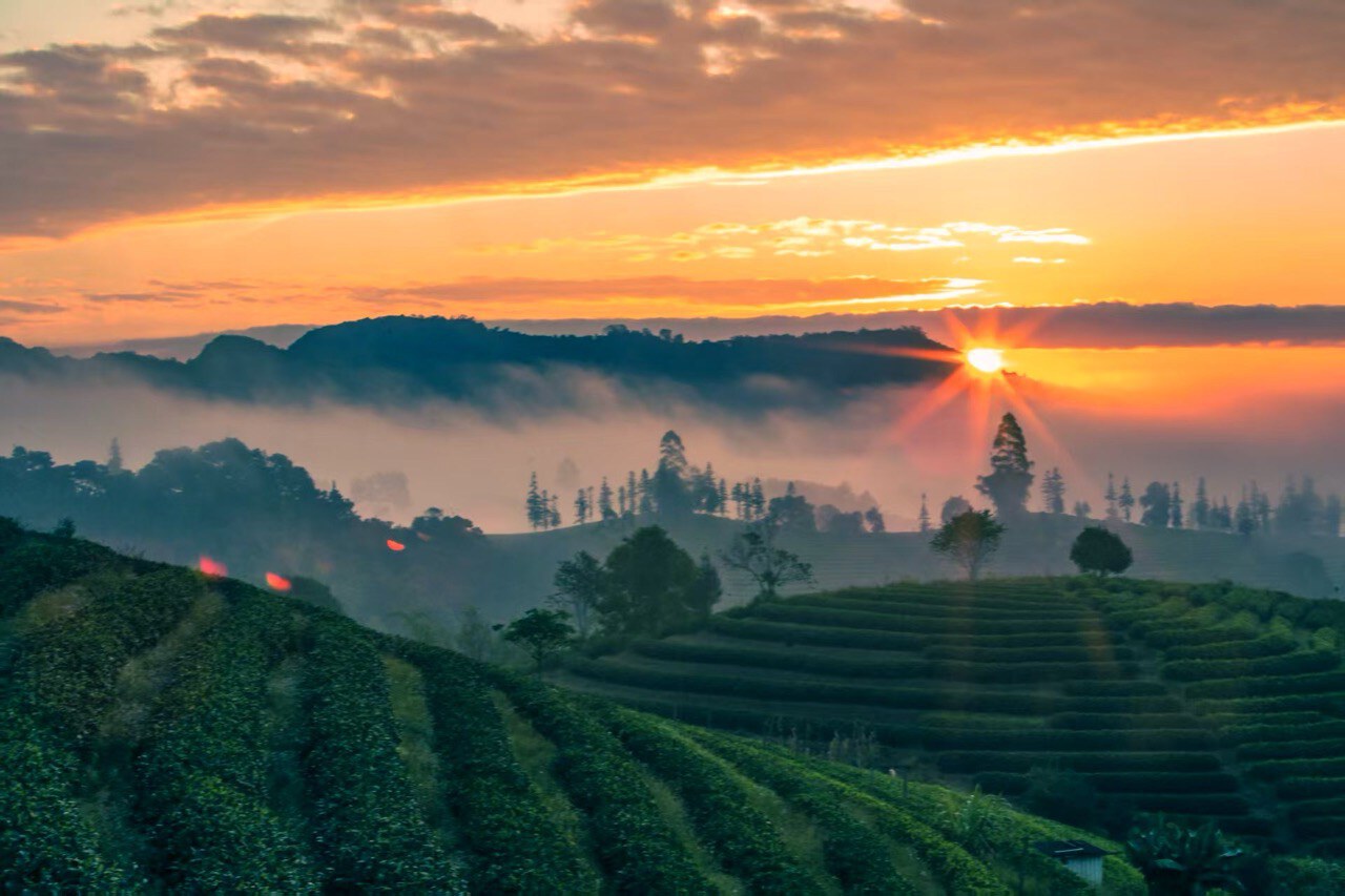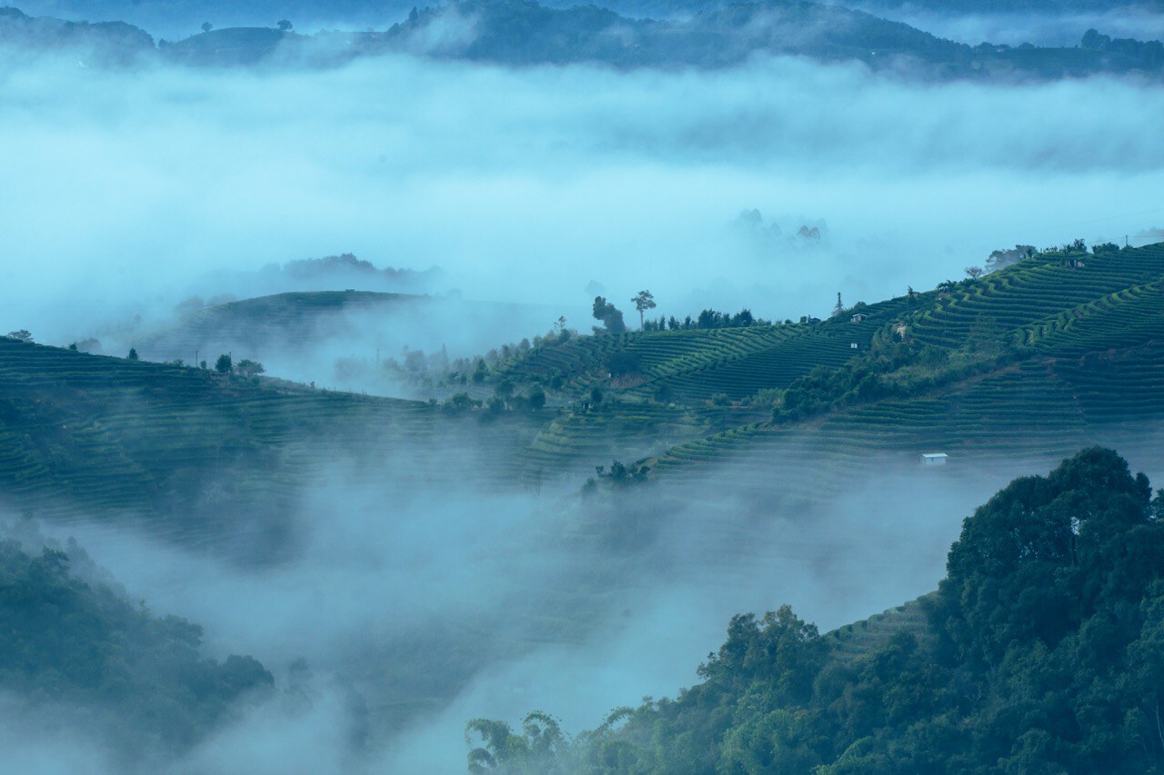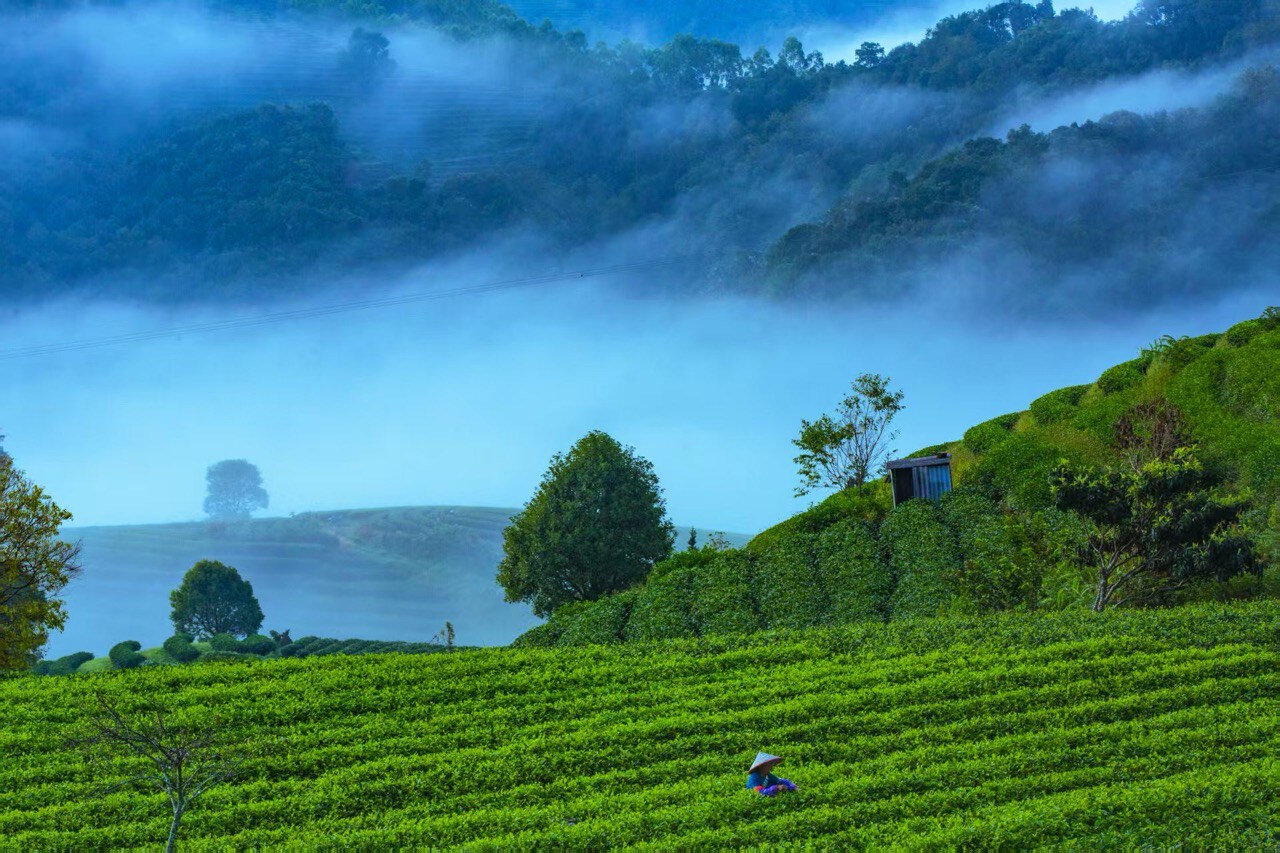 清晨,轻盈的晨雾与壮阔的云海交织,漫过错落的茶园,点点绿意在云雾间隐约浮现,宛如一幅流动的写意山水画卷。