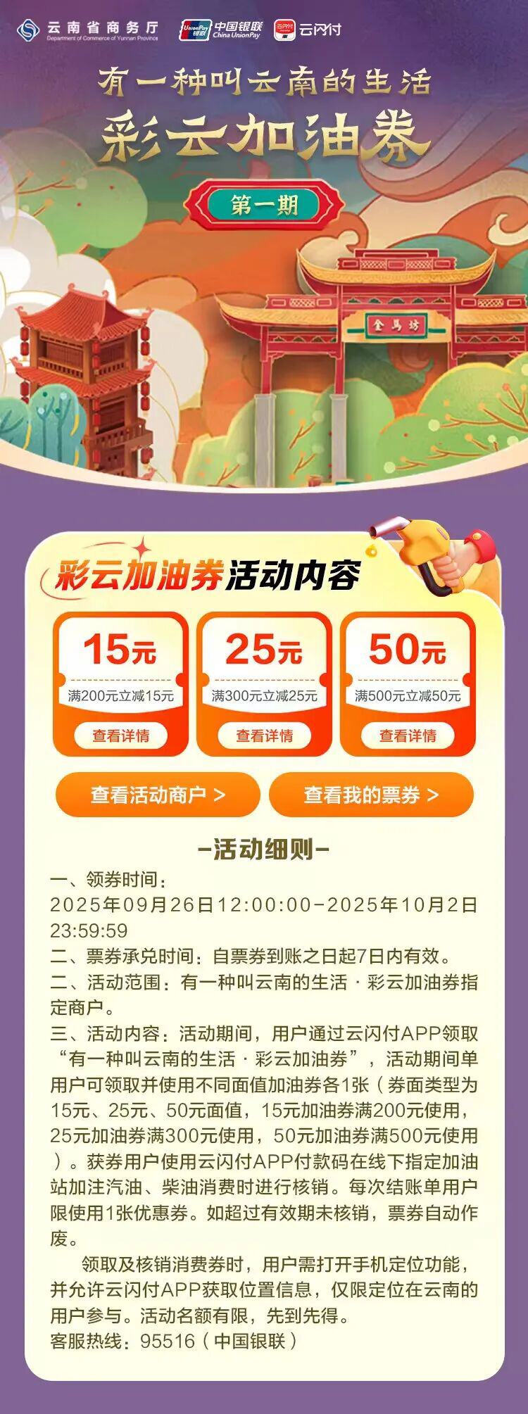 9月26日12点,每位消费者可分别在云闪付、支付宝平台领取15元、25元和50元加油券各一张,其中15元加油券满200元使用,25元加油券满300元使用,50元加油券满500元使用,先到先得,领完即止。