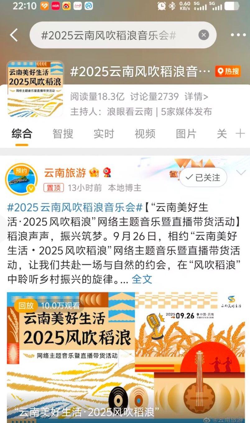 本次活动吸引新华社、极目新闻、大象新闻等中央及省、州市、县主流媒体网站、融媒中心、新媒体平台共计150余家联合直播,75位网络大V现场直播,共吸引全国4600万网民在线观看;微博、抖音、快手等多个商业平台设立#2025云南风吹稻浪音乐会# 主话题进行直播,截止9月26日22点,全网观看量(阅读量)已突破18亿,2个子话题成功登上微博热搜榜。巨大的网络流量推动直播带货,50余位直播带货大Ⅴ直播间热闹非凡,其中@丽江石榴哥直播2小时即实现销售1200余单。