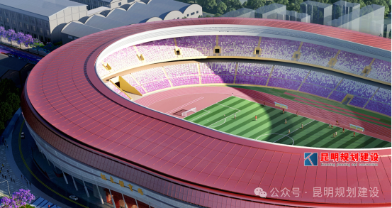 根据云南省拓东体育场及场外设施提升改造项目设计方案,拓东体育场内座椅配色以“蓝花楹”为主题,通过紫、浅紫与白色相互搭配,抽象表现蓝花楹盛放意象,与昆明城市绿化风貌相契合。