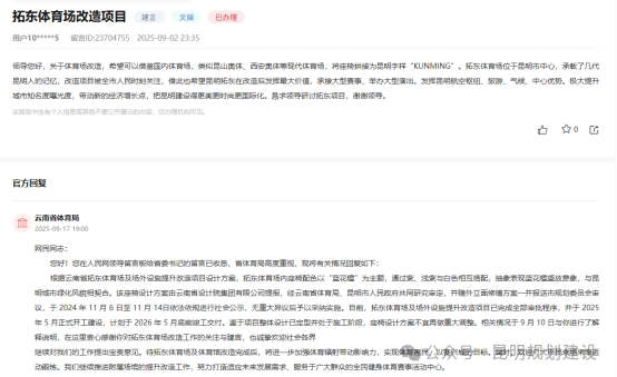 目前,拓东体育场及场外设施提升改造项目已完成全部审批程序,并于2025年5月正式开工建设,计划于2026年5月底前竣工交付。