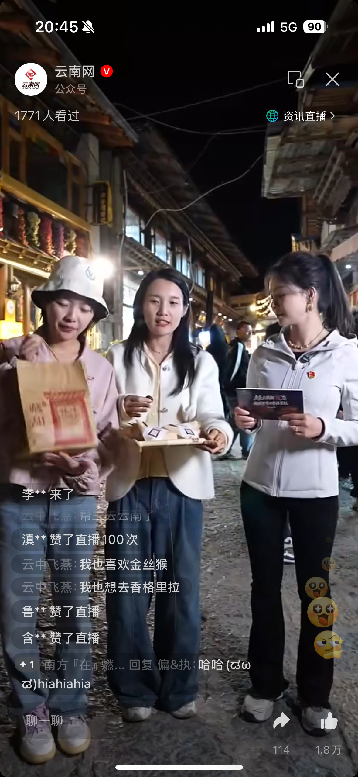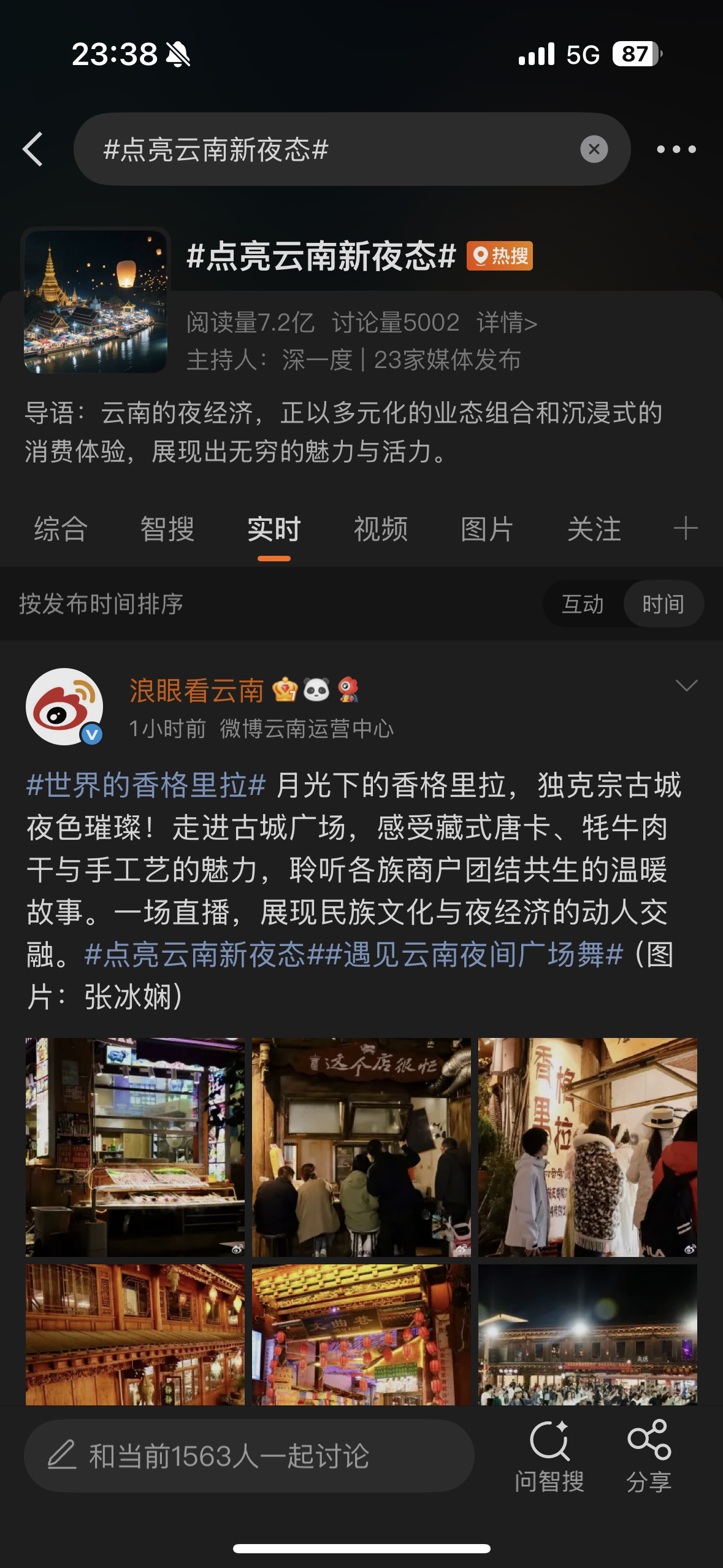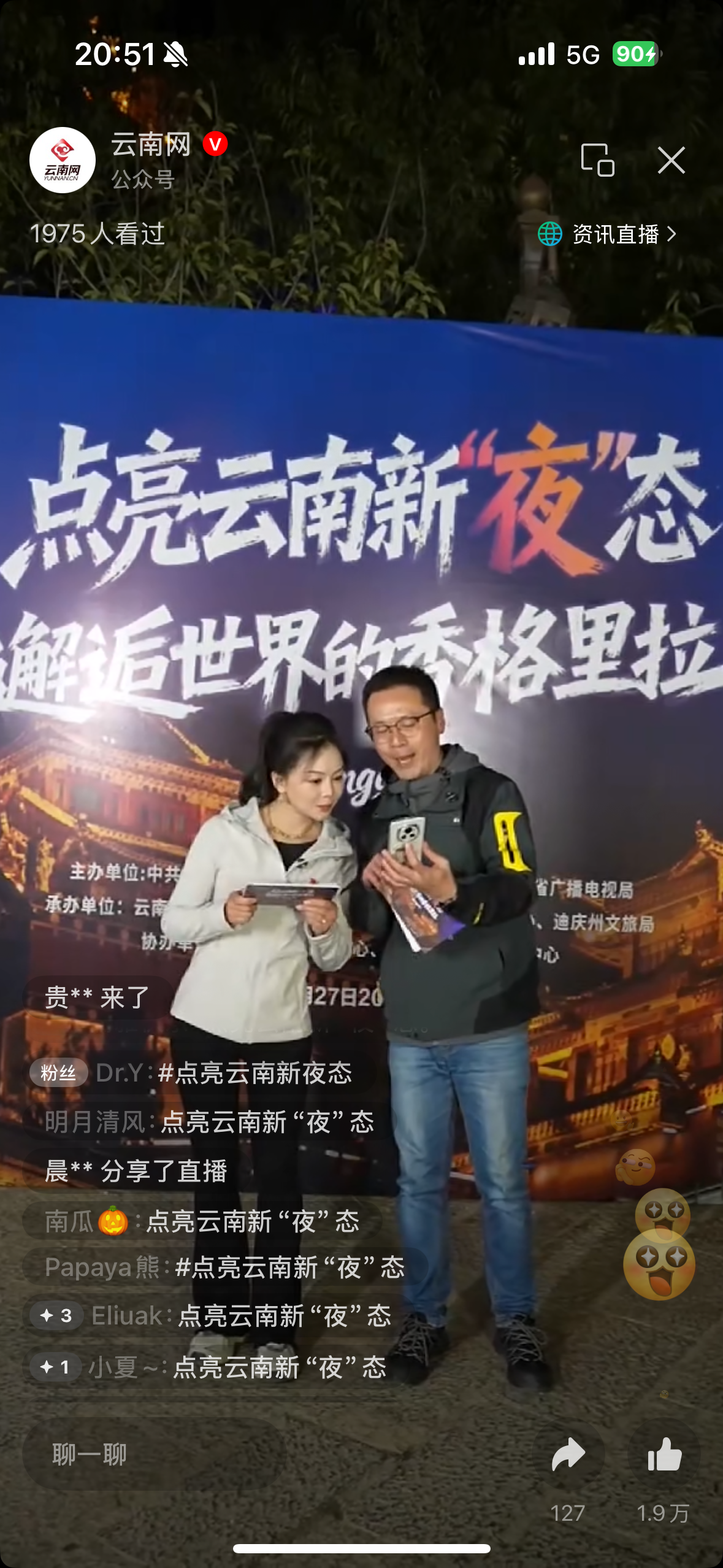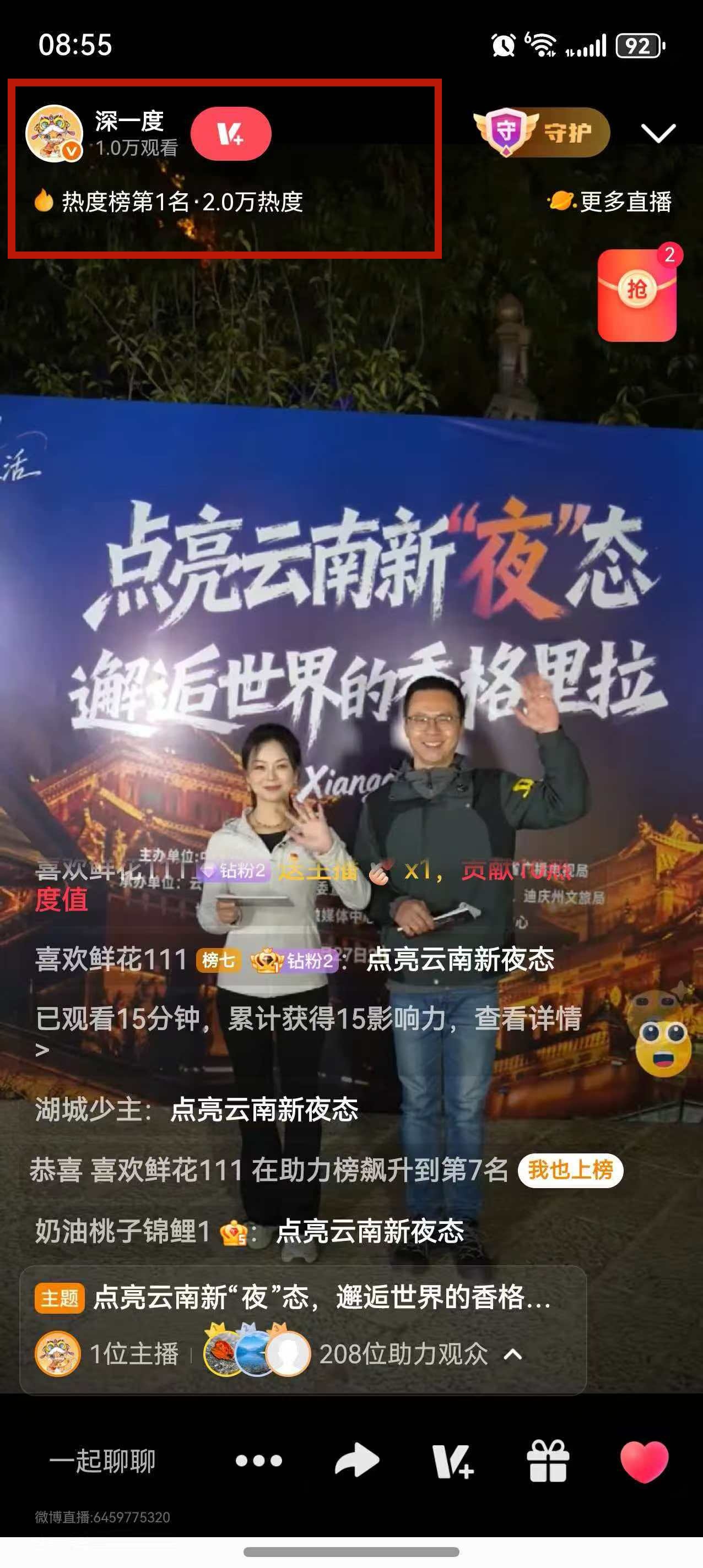 感受香格里拉的夜经济活力,深度体验香格里拉民族团结的鲜活课堂。直播镜头聚焦这座千年古城,穿越高原明珠,将“香巴拉”的璀璨夜色,民族团结一家亲的温度展示在千万网友眼前。当晚,人民网、新华网、央视网、潮新闻、长江云、第1眼新闻、天眼新闻、封面新闻、云南网、云新闻客户端、开屏新闻、新浪微博等20余家网络媒体在抖音、快手、微博视频、微信视频号及自有客户端等近1100多个直播主体同时直播,在线观看人数超1700万,迅速登上微博直播热度榜全国第一。超50位网络达人、非遗传承人、省内外主播,全网近5000万网民在线“云打卡”;微博、抖音、快手、视频号四大平台开设话题#点亮云南新“夜”态 点击量达8.3亿,净增2.3亿。话题#世界的香格里拉 点击量突破22亿,净增3亿余。