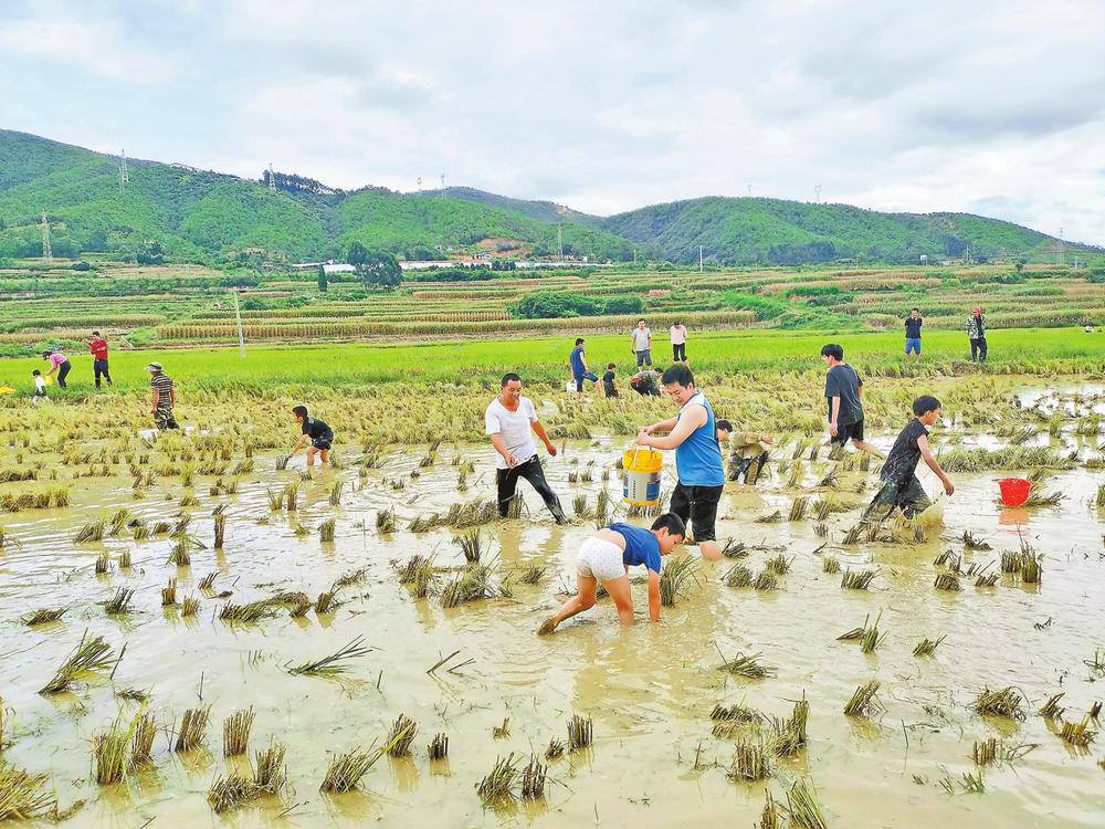 田园间的民俗趣味活动,让游客“沉浸式”体验丰收乐趣。割稻谷比赛、打谷比赛、摸鱼比赛……笑声、欢呼声交织,这里成了欢乐的海洋,凝聚起促进民族团结、助力乡村振兴的合力。