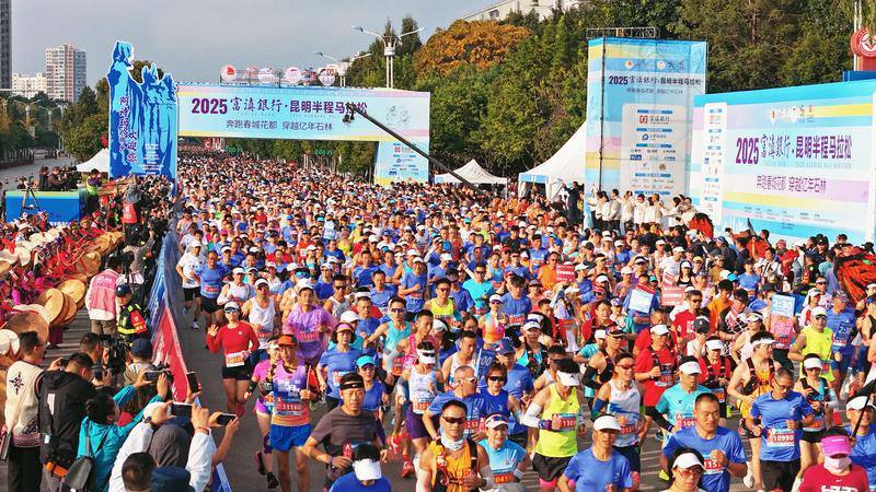 10月12日8时30分,2025富滇银行·昆明半程马拉松在石林彝族自治县鸣枪开跑,万名跑者冲出起跑线,感受着被誉为“世界喀斯特精华”的石林赛道。“奔跑春城花都,穿越亿年石林”,来自全国各地的跑者穿越奇石峰丛,奔跑在亿万年的地质奇观中,用脚步丈量云南的自然与人文。