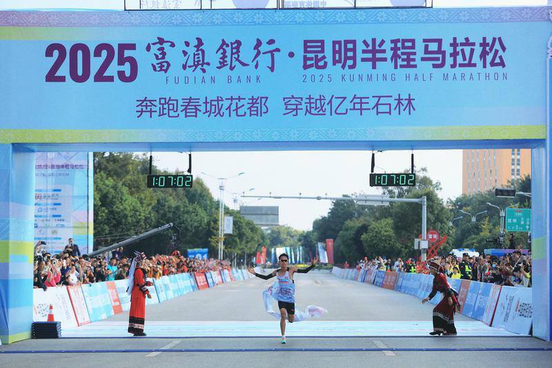 选手蒋金志以1小时7分2秒的成绩夺得2025昆明半程马拉松男子组冠军。