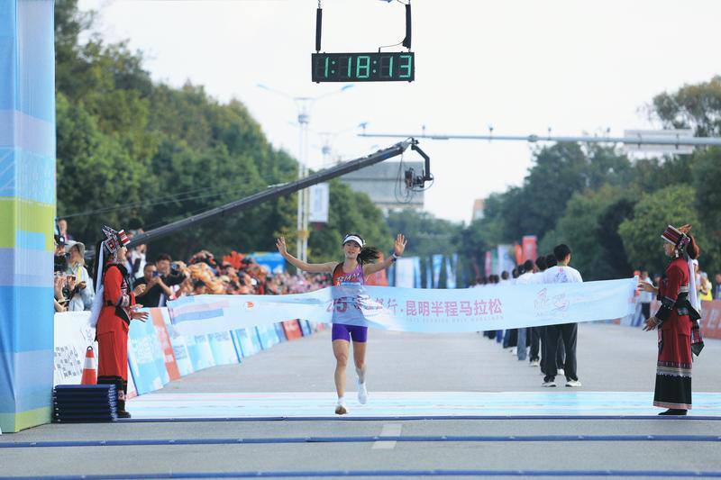 选手蒋洪美以1小时18分12秒的成绩成功夺得2025昆明半程马拉松女子组冠军。