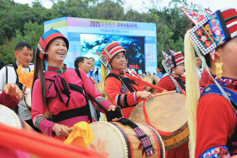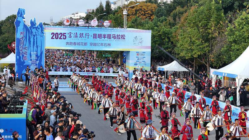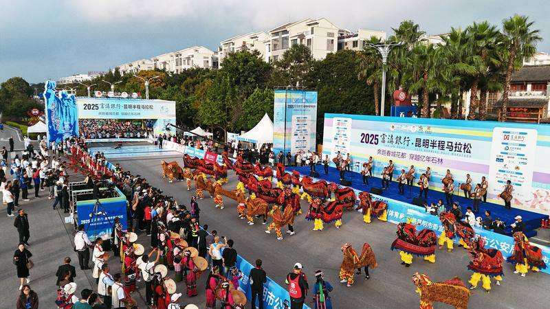 2025富滇银行·昆明半程马拉松不仅是竞技的舞台,更是体育、文化、旅游深度融合的典范。赛事路线贯穿石林风景区,跑者沿途欣赏喀斯特地貌奇观,感受彝族撒尼人的热情歌舞与文化传承。 起跑仪式上,石林本土非遗“狮虎舞”和“大三弦”表演点燃现场气氛。跑者们在奔跑中聆听撒尼民歌,领略阿诗玛文化的魅力,完赛后还可品尝石林人参果等本土特产,体验“赛事+文旅”的全新参与模式。
