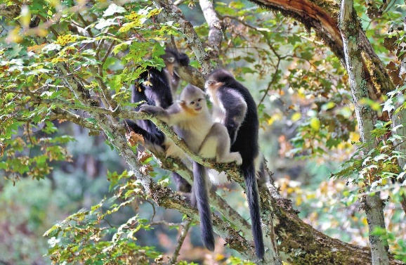 近年来,我省持续推进滇金丝猴栖息地修复工作,通过种植云杉、冷杉等树种,在白马雪山国家级自然保护区等地成功构建起连接滇金丝猴栖息地的生态廊道,滇金丝猴种群数量持续增长。目前,保护区内的滇金丝猴种群数量已增长到约2800只,占全国的65%以上。图为滇金丝猴在位于维西傈僳族自治县塔城镇的香格里拉滇金丝猴国家公园内嬉戏玩耍。