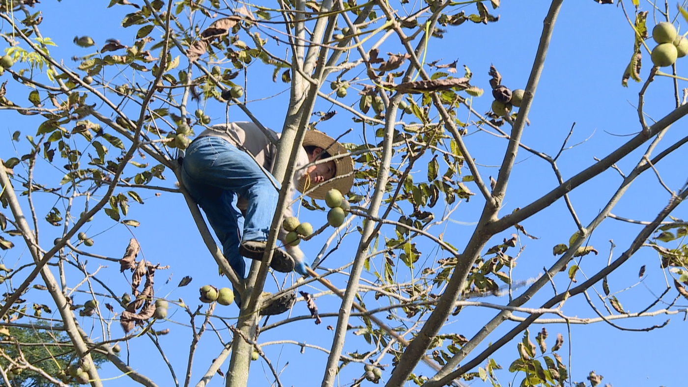 在瓦窑镇横山村,村民余德林一早便与家人来到核桃地。他利落地爬上树干,手持长竿敲打枝条,饱满的核桃如雨点般簌簌落下,滚满一地。“我家种了10多亩,价格比往年好,收入能有一万多元。”望着箩筐里颗颗坚实的“金果果”,余德林脸上绽开了笑容,“管护也不费事,冬天施施肥、涂涂白就行,比种玉米省心。”