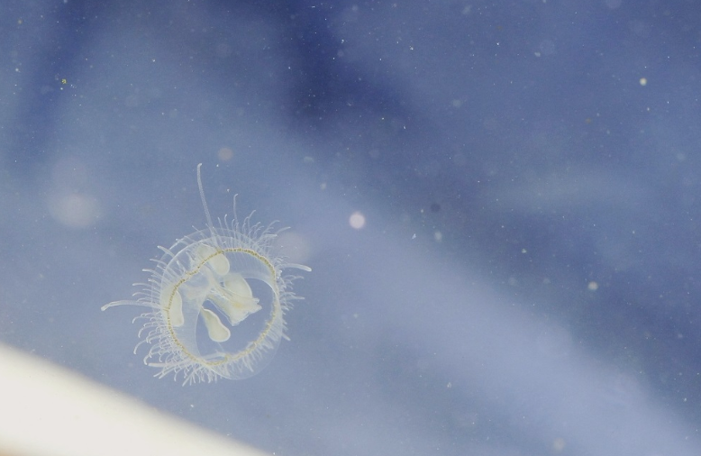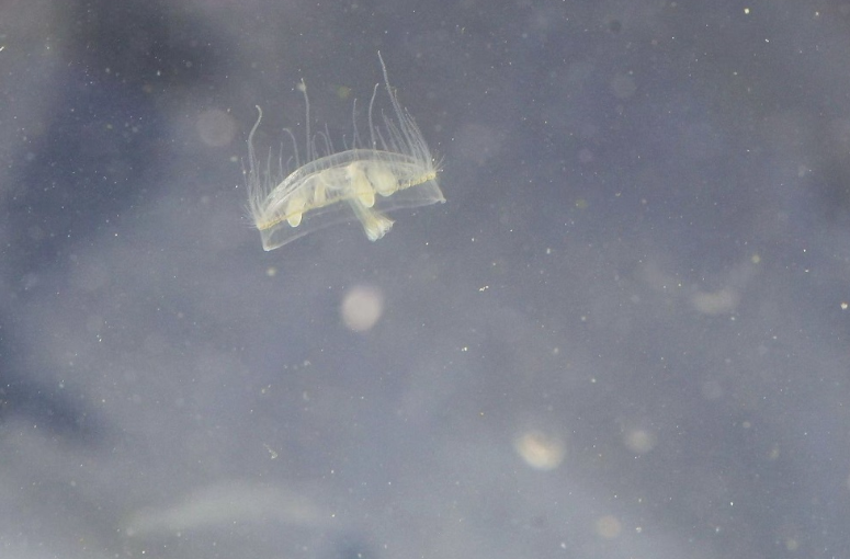 从摄影爱好者拍摄的照片中,记者能清晰领略到桃花水母的独特魅力:它们无头无尾,呈圆润的伞状,通体透明得仿佛一触即碎,柔软的躯体如同丝绸般顺滑;身体周边布满纤细的触角,中间则长着五个呈桃花花瓣状分布的触角状物体,与“桃花水母”的名字完美呼应。在水中,它们时而轻轻收缩躯体,时而缓缓舒展,如同跳着优雅的水中芭蕾,悠然飘荡的姿态尽显“水中精灵”的灵动与柔美。