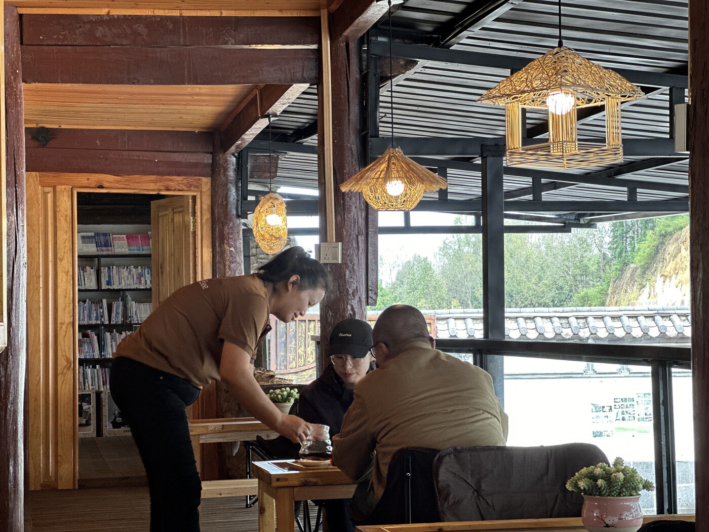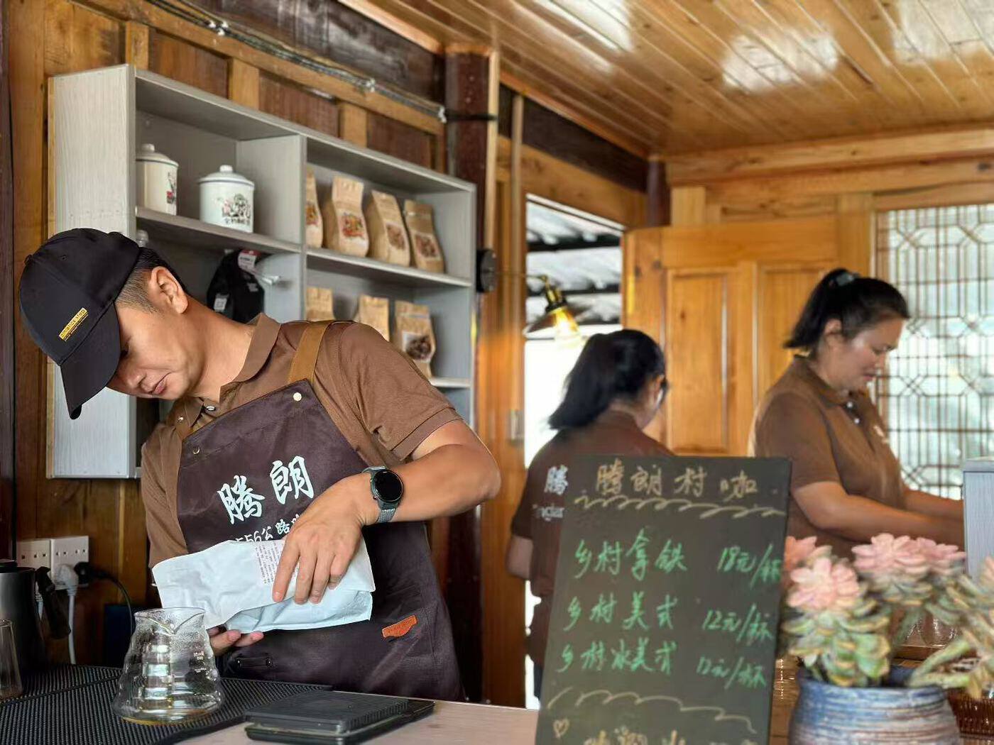 “来,尝尝我们冲泡的咖啡!”身着统一着装的腾朗村“两委”干部,熟练地为游客冲泡咖啡。如今,他们既是服务村民的基层工作者,也是“村咖”的经营者,实现了“一边上班一边经营”的新模式。