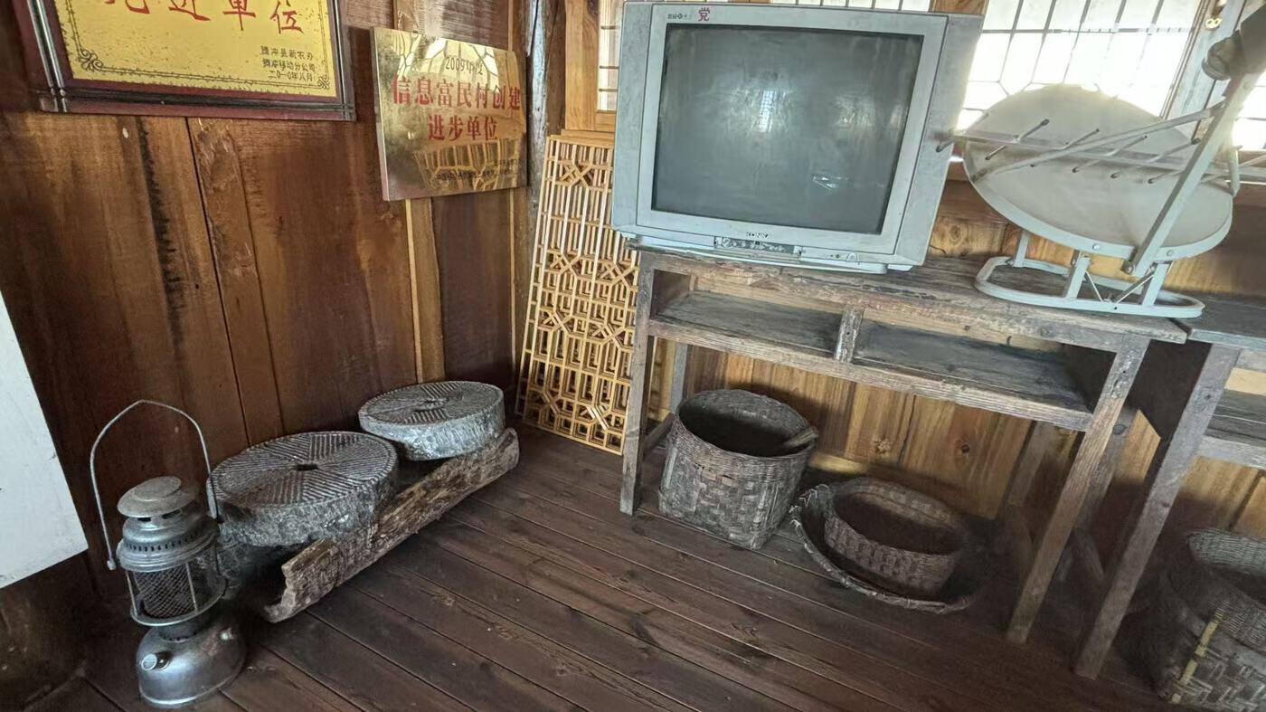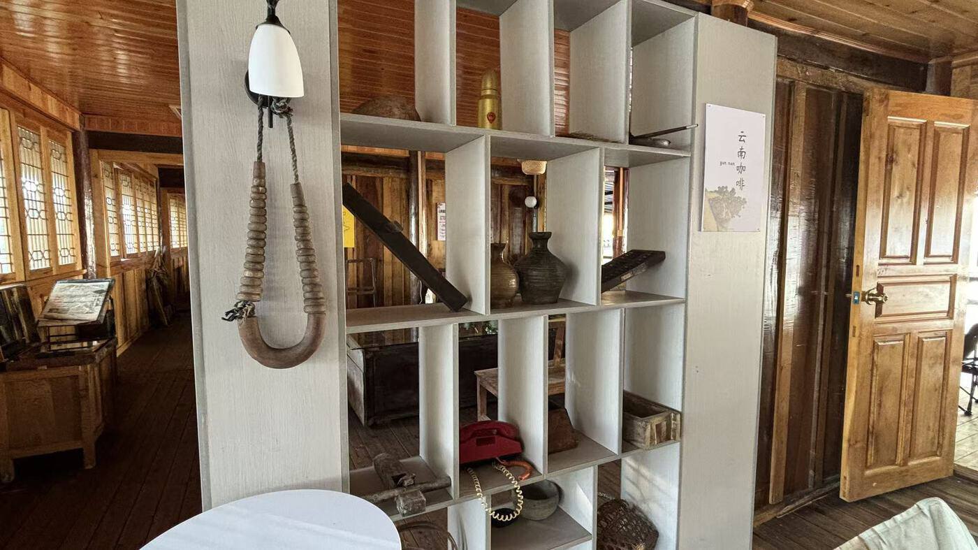 走进咖啡馆,时光仿佛慢了下来:写满字迹的老账本、耕耘过田野的农具、竹编背筐、斑驳煤油灯等老物件静静陈列,诉说着乡村的过往;腊肉、茶叶、草果等腾朗村农特产品整齐摆放,成为展示乡村味道的“活名片”。时尚的咖啡空间与厚重的乡村文化碰撞交融,游客在这里慢品咖啡、远眺梯田,在山野风光中释放身心,沉浸式感受“公路记忆+田园生活”的独特魅力。
