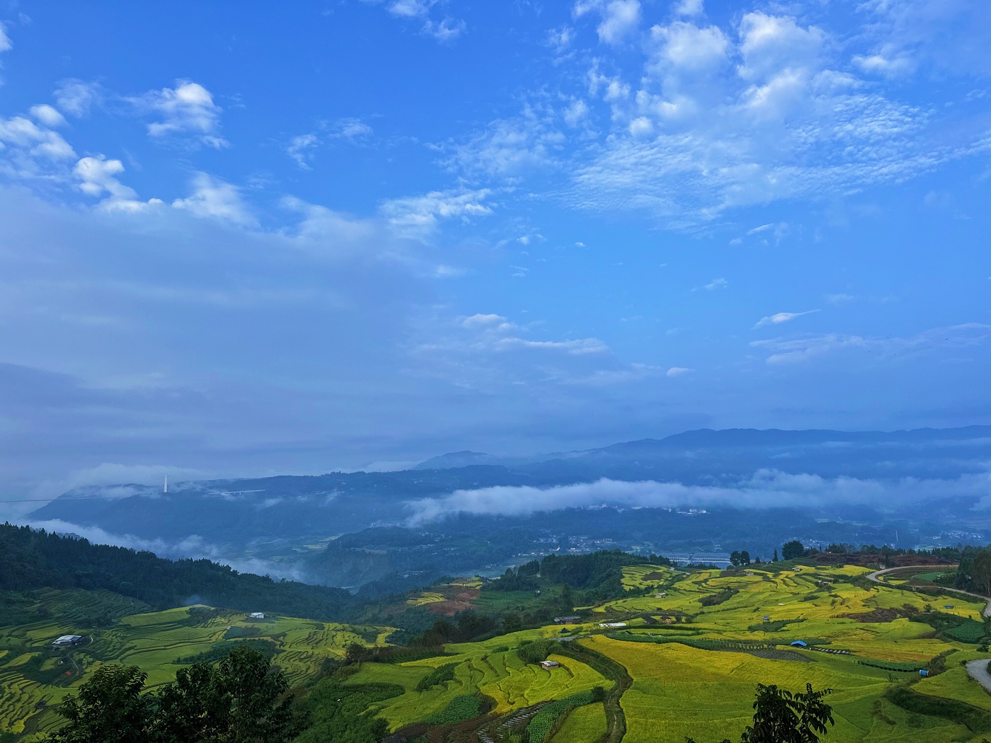 眼下正值腾朗梯田最佳观景期,从“村咖”沿公路下行约一公里,连片梯田铺满金色,与秋收农忙的热闹景象相映成趣。一边是稻浪翻滚的丰收图景,一边是咖啡飘香的惬意时光,山水、田园、咖啡交织成一幅生动的乡村振兴画卷,让游客流连忘返。