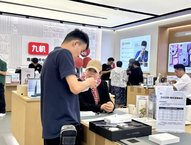 9月25日,云南省昆明市西山区南亚风情园的一家手机旗舰店内,工作人员帮助顾客进行资料迁移和备份。新华社记者王贤思 摄