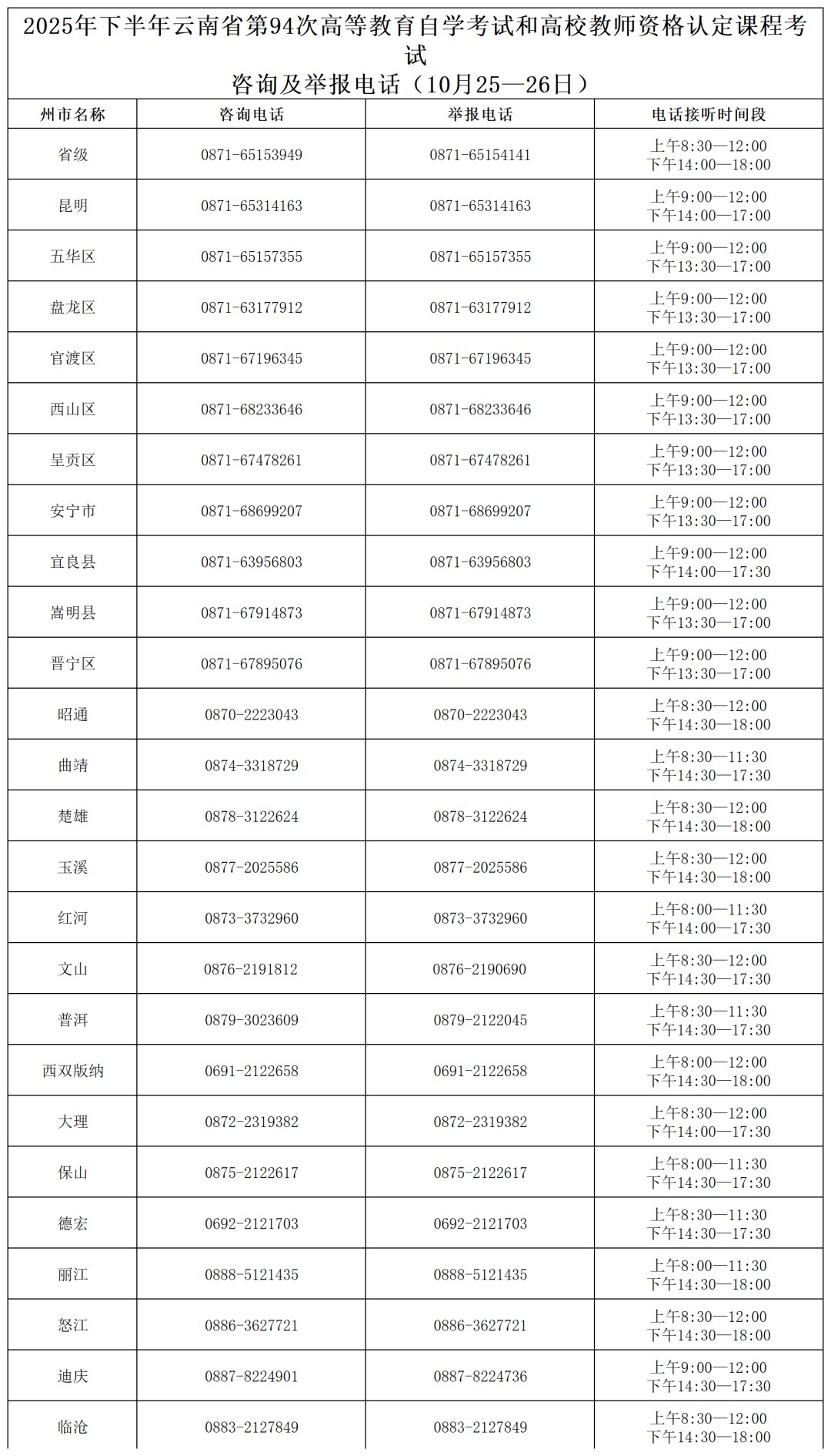2025年下半年云南省第94次高等教育自学考试和高校教师资格认定课程考试部分