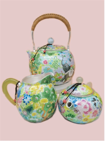 据谭志平回忆,工艺创新带来的改变,在一把暗八仙银壶上。“用炭火炉烤制时,壶身前后的釉面成熟度很难把控,往往前面光滑但后面欠火候,失败了很多次。”谭志平说,后来,自己跟电焊工一起研究特制风罩,使用电烤炉把控不同釉料的成熟温度和时间,复杂的大件珐琅银器制作实现突破。如今,谭志平工作室注重改良创新,已有4大类800多个种类的产品。2013年,其作品《掐丝珐琅彩银鱼嬉荷塘酒具》获得全国非遗联展金奖。