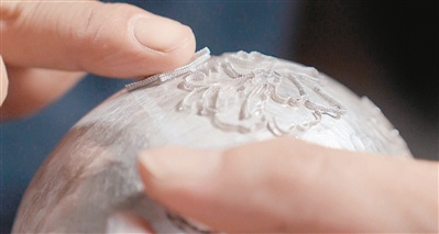 “以银为胎,掐丝为骨,珐琅作魂”是谭志平制作珐琅银器的秘诀。烧制银器成型后,谭志平用极细的银丝勾勒图案,这一步叫“掐丝”。“0.3毫米的银丝要18次弯折,才能勾勒出牡丹的美。”谭志平说,银丝图案定型后,再小心翼翼地给银器加温,让银花焊牢在银壶上。经过清洗后,下一步就是“填蓝”。