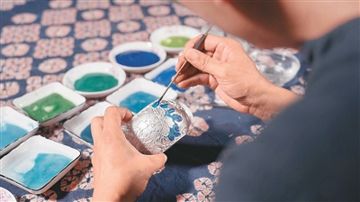 透明滴管中盛着翠蓝珐琅釉料,银壶表面是掐丝绘就的牡丹纹样。沾着颜料的手轻轻捧起壶身,谭志平目光专注,如同手握银针的绣娘。“填蓝跟绣花一样,是个精细活。”