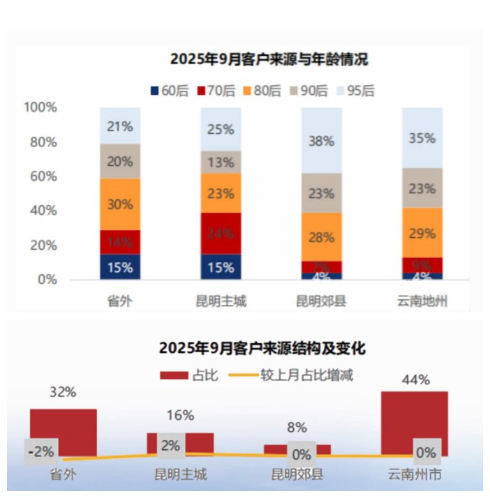 从客群来看,9月,省外客户占比32%,环比下降2个百分点,昆明主城上涨2个百分点,郊县与州市客户稳定;分年龄段看,省外70后避暑旅居客占比下降6个百分点,90后刚需置业客户比例提升,主城本地70后为子女购房客户占比提升3个百分点,州市80后功能改善客户占比提升4个百分点。
