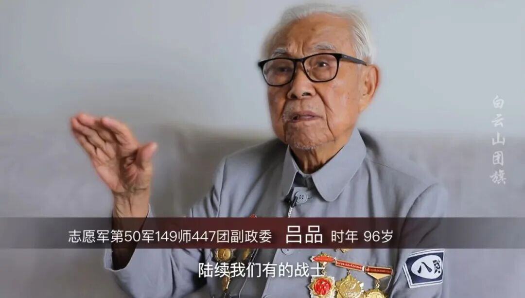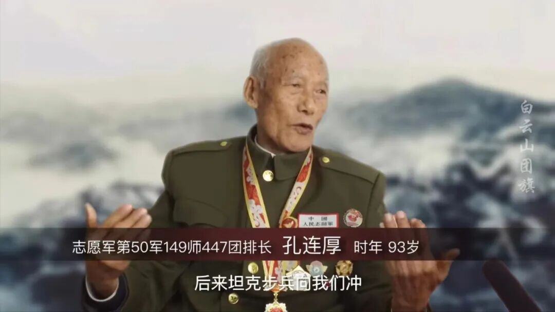 “敌人他有飞机、坦克、大炮,总是狂轰乱炸。不仅是一般的炸弹,还有叫作凝固汽油弹。这个凝固汽油弹比一般炸弹还要厉害,只要蹦出来一点凝固汽油,粘在你身上,你扑都扑不掉,活活就能烧死。五昼夜,打到第五天,一个六连一百多人,剩下一个指导员带三个战士,仍然要守住这个阵地,‘有人在,阵地在!’这是我们的口号。”
