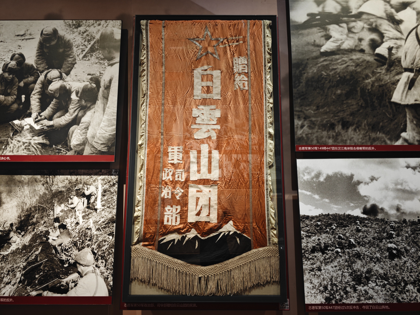 这是志愿军第50军司令部、政治部赠给“白云山团”的奖旗。质地为丝和棉麻纤维,长180厘米、宽84厘米,是国家一级文物,它记录了志愿军第50军149师447团在白云山战斗中英勇顽强、坚守阵地的英雄事迹。
