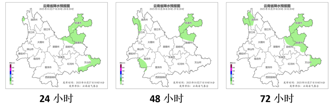 11月1日至2日冷空气向西向南移动与西南暖湿气流配合影响,昭通市、曲靖市北部、昆明市北部、楚雄州、玉溪市西部、怒江州、迪庆州南部、丽江市、大理州东部、普洱市、西双版纳州、红河州南部有中雨局部大雨、暴雨,迪庆州北部高海拔地区有小到中雪或雨夹雪,其他地区有小雨局部中雨;西北部、中东部地区气温持续偏低。