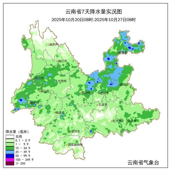 今年以来(2025年1月1日至10月26日),据国家气象观测站监测,云南省平均降雨量1158.6毫米,较常年同期偏多153.6毫米(偏多15.3%),比去年同期偏多232.7毫米(偏多25.1%)。全省平均气温18.3℃,较常年同期偏高0.3℃,比去年同期偏低0.7℃。