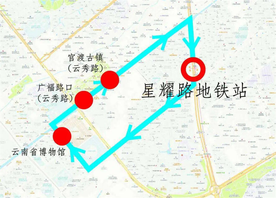 途经站点:星耀路地铁站、云南省博物馆、广福路口(云秀路)、官渡古镇(云秀路)。