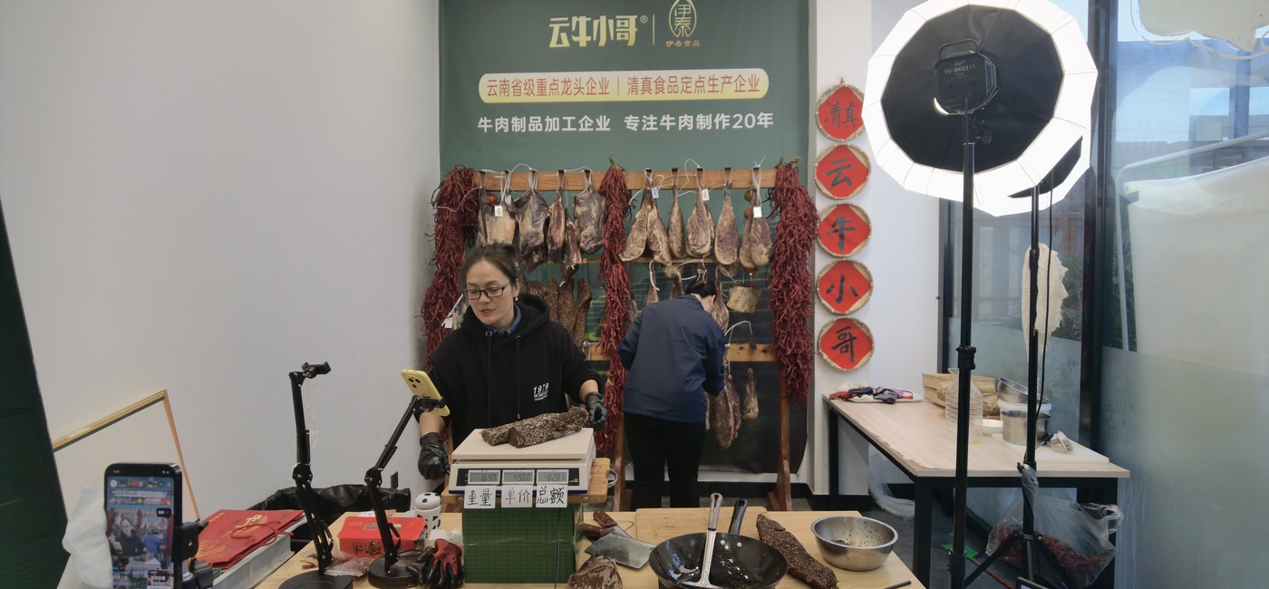 “感谢支持!坐等收货!”伊泰食品有限公司“云牛小哥”官方直播间里,主播麦瑞熟练地拿起一条雪花牛干巴,称重、报价,然后被网线另一端的网友秒速拍下。2024年,“云牛小哥”直播间光是牛干巴就卖了800多万元,该公司在寻甸的旗舰店更是突破千万销售额。