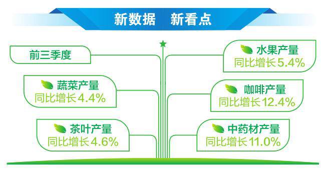 今年前三季度,全省蔬菜产量2338.75万吨、同比增长4.4%,水果产量1188.38万吨、同比增长5.4%,茶叶产量53.97万吨、同比增长4.6%,咖啡产量4.50万吨、同比增长12.4%,中药材产量61.10万吨、同比增长11.0%。