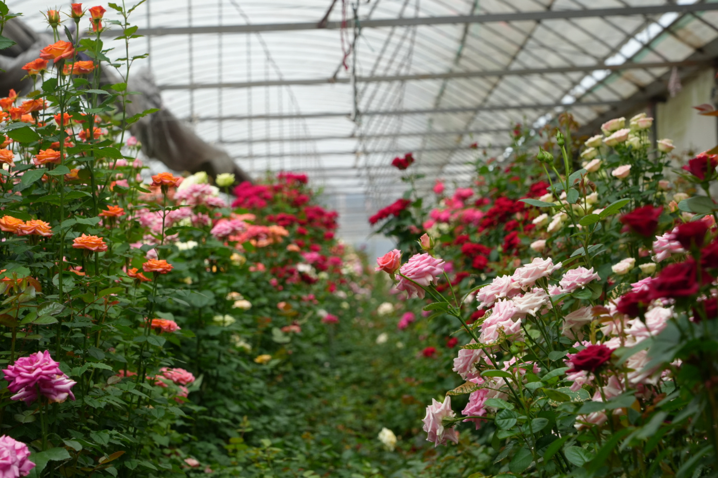 午后,通海锦海农业科技发展有限公司试验花房内,超过1200株玫瑰、月季竞相盛放,一株花就是一个品种。
