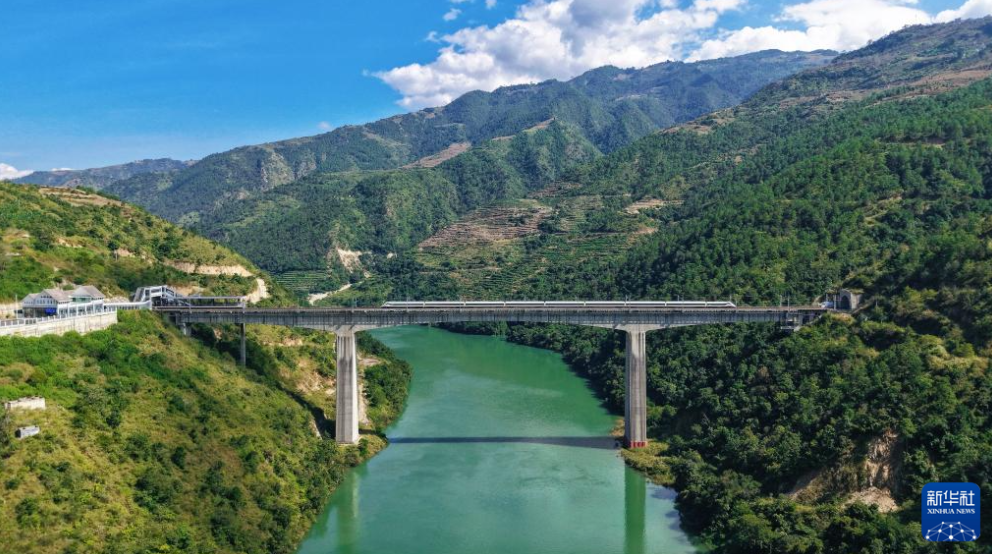 10月30日,一列动车组列车经过小湾东站(无人机照片)。