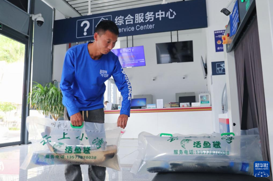 10月31日,工作人员将装袋、加氧后的小湾东镇生态江鱼放上安检设备,准备通过高铁动车运往昆明。