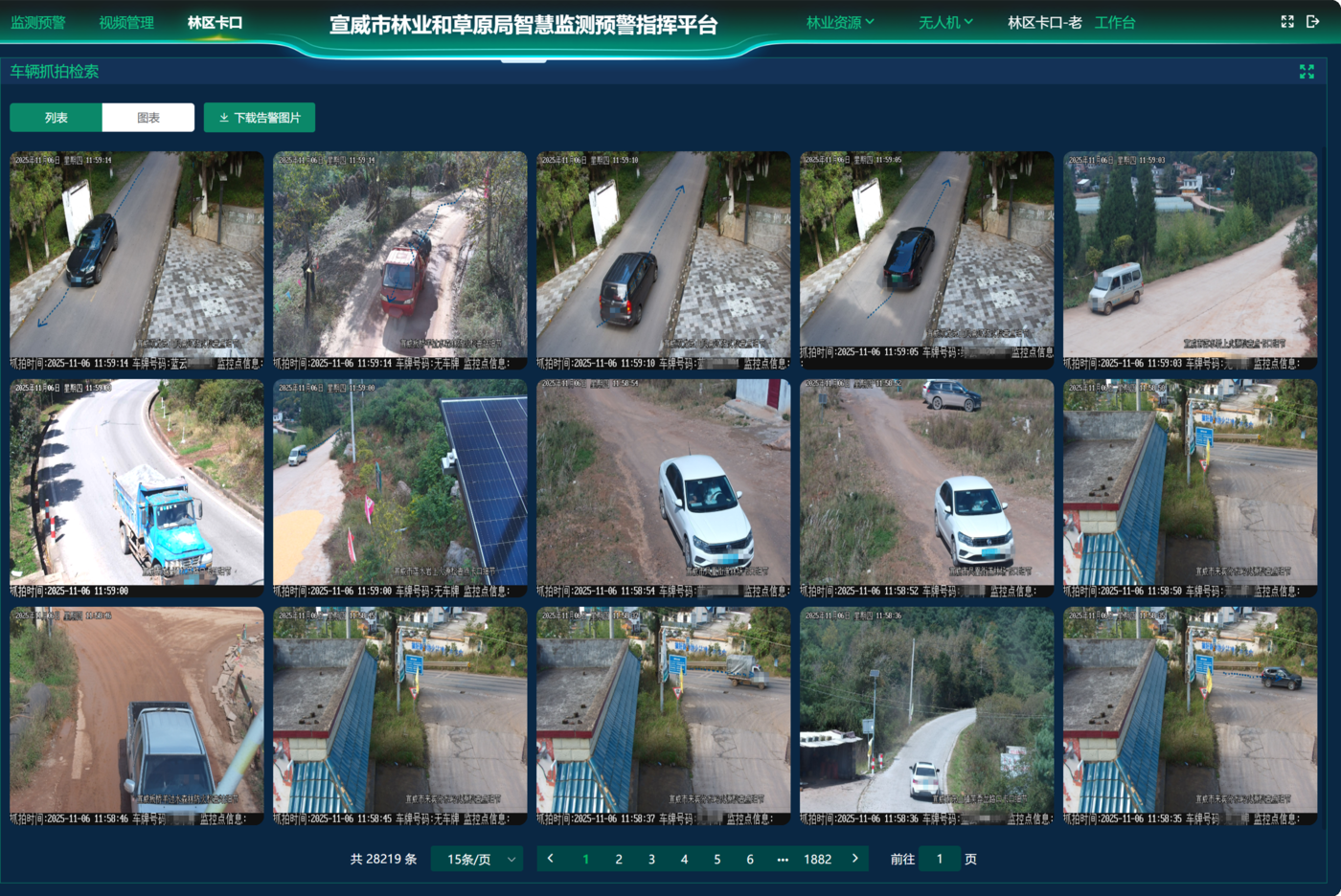 智慧监测预警指挥平台部署区域内,28套智能卡口系统如同恪尽职守的“电子哨兵”,守卫着重要入山口和路段。每一辆经过的车辆、每一位进入林区的人员信息都被精准记录,可谓“车过留牌、人过留脸”。这些卡口不仅与火情告警联动,为事后溯源提供依据,还搭配音柱自动播放宣传警示内容,成为防火期重要的宣传阵地。