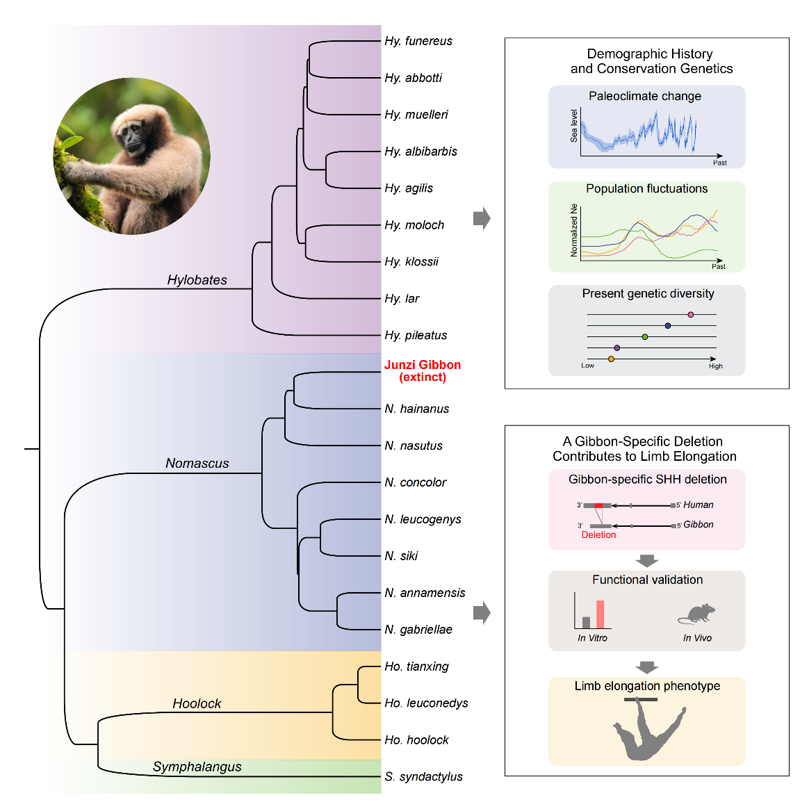 长臂猿的“超长手臂”是怎么演化来的?秦始皇祖母墓长臂猿到底是哪类长臂猿?北京时间2025年11月8日,由中国科学院昆明动物研究所牵头联合多家科研机构,在国际学术期刊《细胞》(Cell)上发表长臂猿基因组研究论文。该研究首次系统阐明了长臂猿科的演化历程、种群动态及其标志性长臂表型的遗传基础,为全球长臂猿的保护行动提供了新的科学见解。