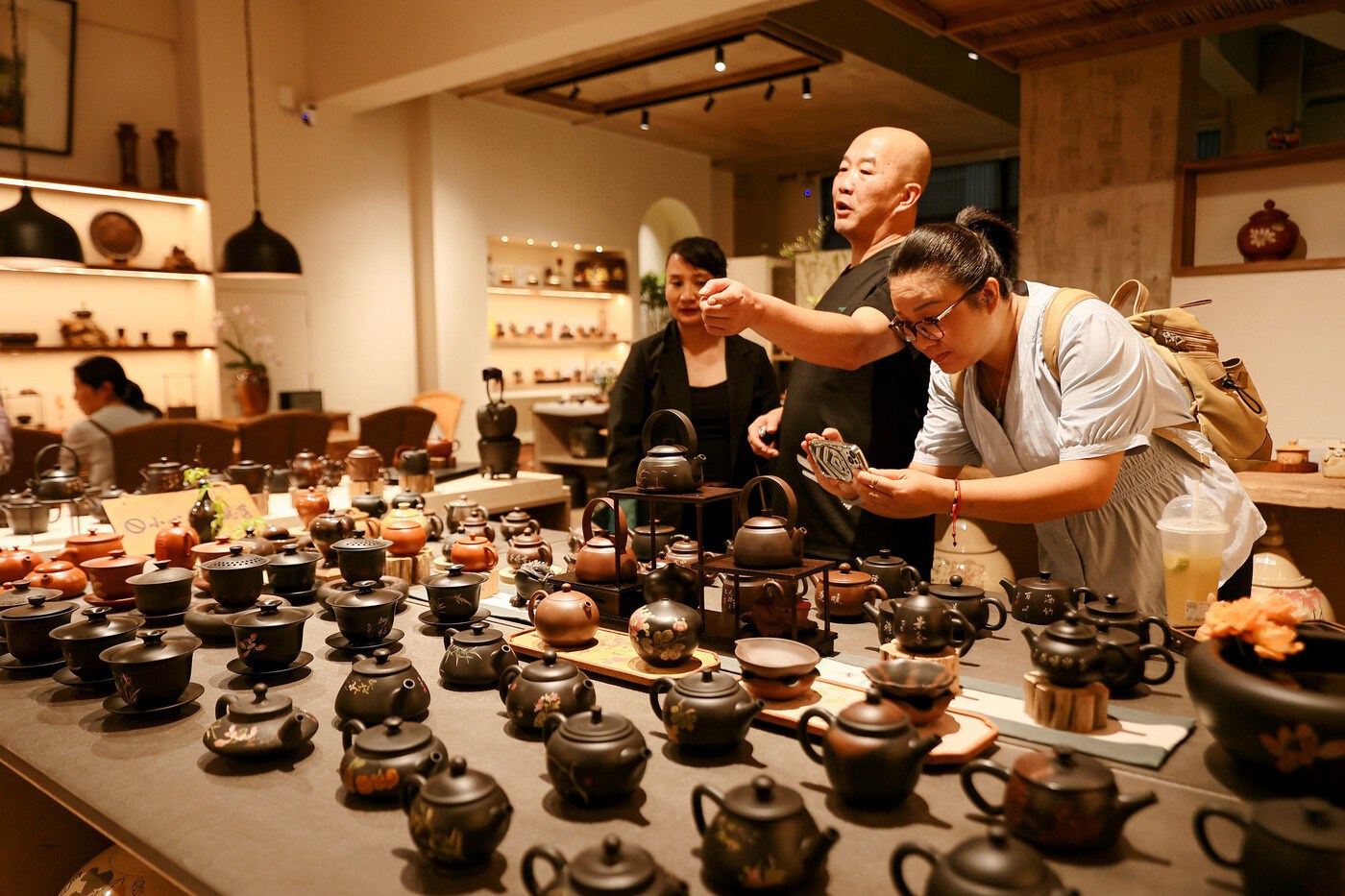 游客在紫陶店内挑选紫陶茶具。记者 胡妤雅 摄