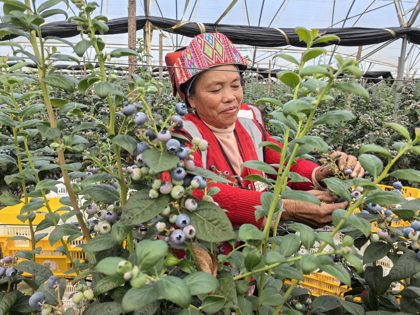 11月下旬,光筑农业集团在文山州丘北县维摩乡的蓝莓大棚里,青涩的果实连日来次第泛起红晕,继而沉淀成深紫,披上银白的薄纱——那是果粉,是蓝莓可以卖上好价钱的印记。家住附近的村民杨绍梅指尖轻点,正在仔细采摘蓝莓,她和同伴每天平均能有150到250元的工钱,在传统的农闲季拓出增收新渠道。